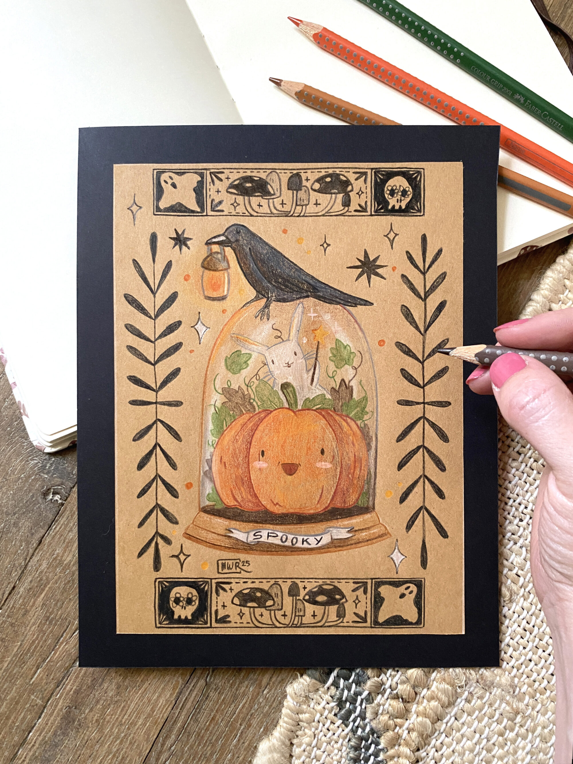 Dans une atmosphère bienveillante et détendue, vous apprendrez à composer aux crayons de couleur une illustration originale : un petit monde d’automne magique, inspiré des cabinets de curiosités, des citrouilles, corbeaux, lanternes et autres symboles d’Halloween.