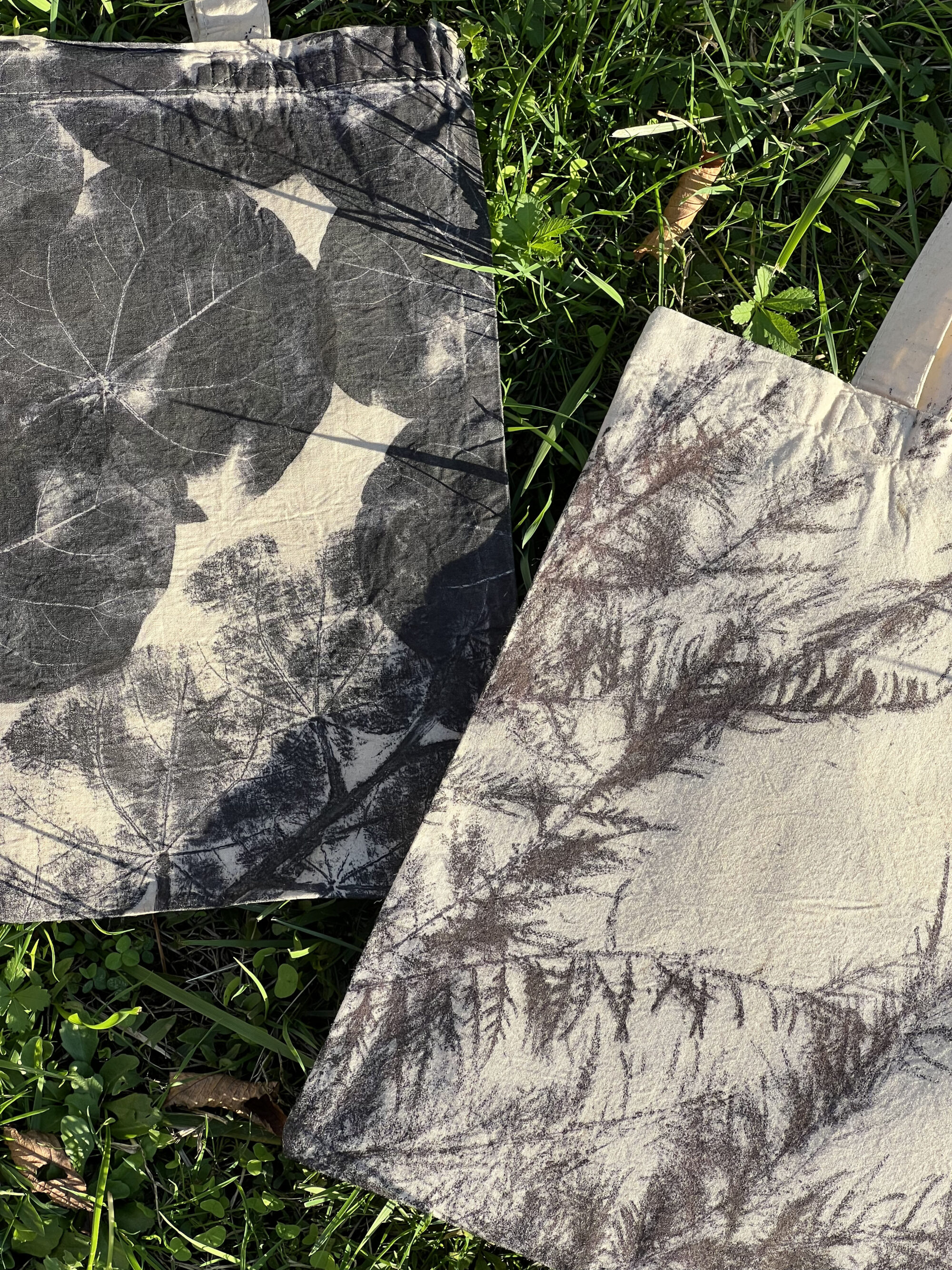 Après un temps de cueillette, il suffira d’imprimer les végétaux sur un sac totebag en coton, fixer et révéler la teinte par un bain de fer.